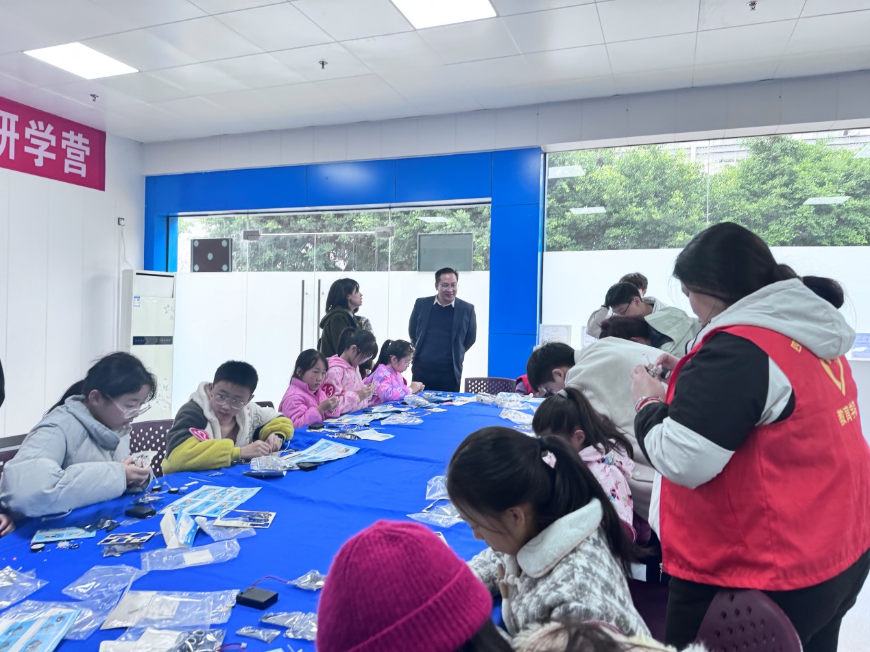 最热闹的当属智能小车拼装环节:蓝色桌布铺就的操作台上,零件包、说明书整齐摆放,小朋友们分组协作,在志愿者指导下识别零件、校准结构,拧紧每一颗螺丝。“我的小车轮子动啦!”当第一辆拼装完成的小车平稳启动,现场响起阵阵欢呼,成就感写满孩子们的脸庞。