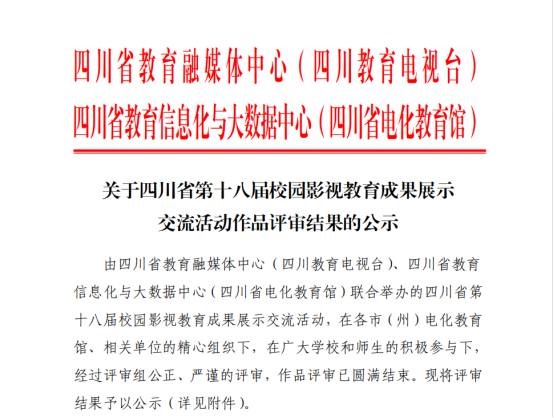 近日,由四川省教育融媒体中心(四川教育电视台)、四川省教育信息化与大数据中心(四川省电化教育馆)联合举办的四川省第十八届校园影视教育成果展示交流活动中省级作品进行了获奖公示。