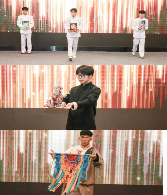 随后,展览以“旅韵文心·绣绘次元”和“旅创拾珍·衣·境”两大篇章,集中呈现服装、蜀绣、动漫、旅游、食品雕刻等作品。省级一等奖动漫《且微》、智慧文旅大赛一等奖“梅朵儿”、藏式挂毯及福禄寿喜刺绣系列等佳作,展现了同学们深厚的专业功底与青春创意。