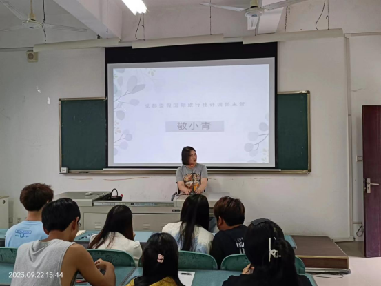 2023年9月22日下午,2018届旅游专业优秀毕业生,成都耍假国际旅行社计调部门主管敬小青学姐为大一和大二旅游管理的学弟学妹们做了一场精彩的行业交流。