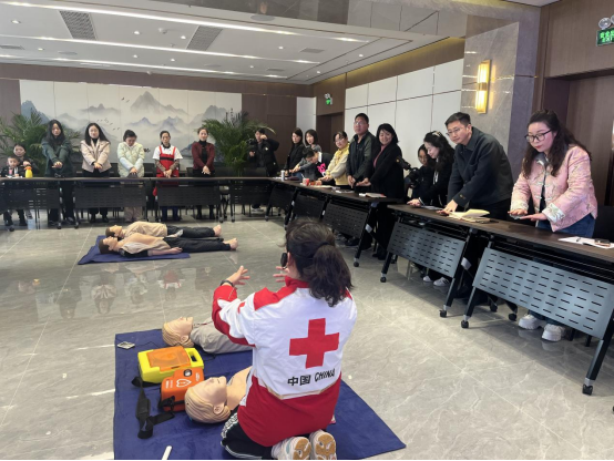 培训中,龙泉驿区红十字会应急救护师、四川华新现代职业学院文创旅游学院副院长张丽妍老师为大家详细讲解了心肺复苏急救知识、AED 的使用注意事项及规范化操作方法,并让教职工分组进行现场心肺复苏及AED实践操作训练,及时纠正学员的错误和不规范操作。