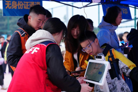 在“无身份证通道”服务点,志愿者正耐心协助参赛选手完成身份核验。手持设备精准操作,轻声指引流程,即使面对突发情况也从容应对,用专业服务筑牢活动第一道保障线。