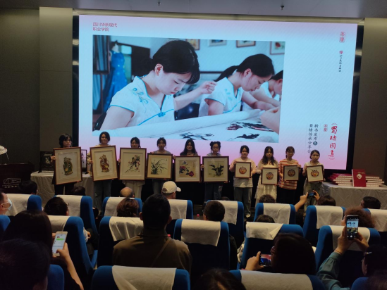 四川华新现代职业学院蜀绣专业作为高校代表,在本次活动中发挥了重要作用。文创学院书记陈丽玉作为特邀嘉宾,不仅出席了新书发布仪式,还接受出版社赠送的精美«蜀绣图集»。这本图集汇聚了众多蜀绣精品,通过精美的图片和文字介绍,生动展示了蜀绣的独特技艺和深厚文化内涵。