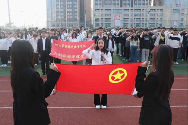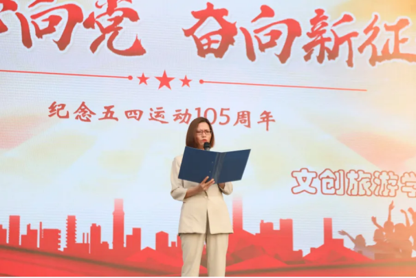 学院党支部书记陈丽玉在仪式上讲话。她充分肯定了过去的一年里,文创旅游学院广大青年师生在各领域所取得的突出佳绩,用实际行动彰显了新时代青年乐观向上、勇于担当的青春风采。陈丽玉书记希望广大青年要牢记习近平总书记的殷切嘱托,立志民族复兴,不负韶华,不负时代,不负人民,在青春的赛道上奋力奔跑,争取跑出当代青年的最好成绩。