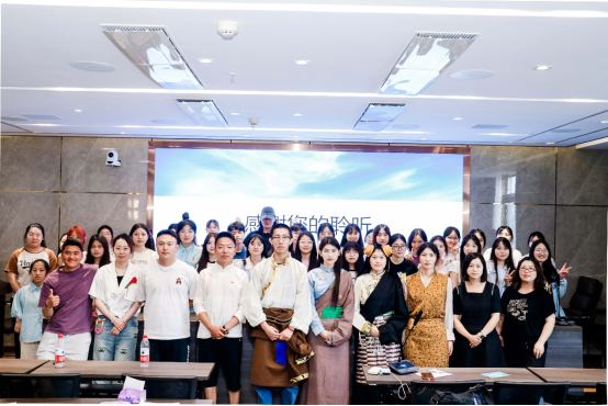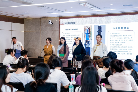讲座开始,斯郎总监介绍了传统藏族服饰与改革、藏族传统工艺等内容。由于地域和文化环境的影响,藏族服饰形成了独特的风格和特点。藏族服饰的分类非常丰富,主要可以分为安多、康巴和拉萨。四川甘孜藏族服饰属于康巴服饰。藏族的毛织技艺具有悠久的历史,其制品以尼热、氆氇、绑典、毡子等面料为主。讲座现场,邀请了4名学生作为模特,现场演示了传统藏服与现代藏服的穿着方式。这引起了学生们的强烈兴趣。学生们了解了康巴藏族服饰中一只袖子如何穿脱、腰带如何系、以及在劳作时如何调整服饰等等内容。