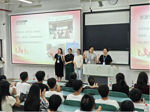 在教学与学生管理介绍环节,文创旅游学院副院长王娟详细解读了教学教务相关规定,从课程设置、考试要求到实践安排,全方位为新生们梳理了大学学习的核心要点。随后,学院学工队伍成员逐一亮相,杨婷婷副书记还针对学生管理工作进行了具体说明,涵盖日常考勤、奖助勤贷、校园活动等内容,让新生们对大学的日常管理与生活保障有了清晰了解。此外,大二学长也来到现场,分享了自己的大学学习与生活经验,用真实的经历为新生们提供参考,助力他们更快适应大学生活。