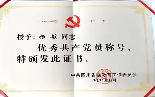 杨敏同志充满干劲、为人师表、工作业绩优秀,先后获得“四川省大学生思想政治教育先进工作者”、“四川省三八红旗手”荣誉称号。另外,她积极参与教学科研,表论文十余篇,主持并完成科研课题四项,获奖五项。她组织带领学生参加创新创业大赛,获得省级金奖。她主动学习教育学、心理学专业前沿知识,提升育人能力。她树立了优秀共产党员的先锋形象,为学校工作和党的教育事业做出了积极贡献。