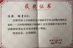 “路漫漫其修远兮,吾将上下而求索”,任燕同志在教研路上持续充电。多年来,她注重自身专业素养提升,经常与同事们进行交流研讨。一分耕耘,一分收获,在多年的努力下,任燕同志获得国家开放大学导学教师优秀论文三等奖,国家开放大学“我的学习故事”演讲大赛优秀指导教师,“神奇的中医”—“2021年全国职业院校外语微课优秀作品征集与交流活动”四川省优秀作品一等奖、全国优秀作品二等奖,四川开放大学第四届青年教师教学竞赛(决赛)优秀指导教师奖,“感恩资助心向党 政策宣传我来讲” 微视频征集活动学生资助工作者三等奖,并多次获得学校优秀教师、教学效果优秀奖、优秀党务工作者、先进个人等荣誉。公开发表论文16篇(核心期刊3篇),编写参编书籍2部,主持校级课题3项,参研省级、校级课题数项。