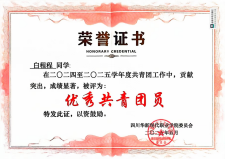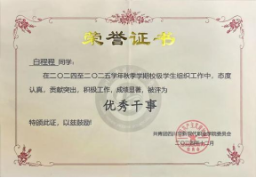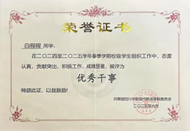 白程程同学曾获2025年创业大赛二等奖、职业规划三等奖、军训优秀学员、普通话证书等多项荣誉,展现了全面发展的个人能力。综上所述,白程程同学思想进步、学业优异、科研创新突出、社会实践丰富、学生工作扎实,是一名品学兼优、全面发展的优秀学生。