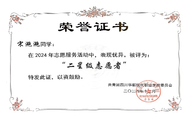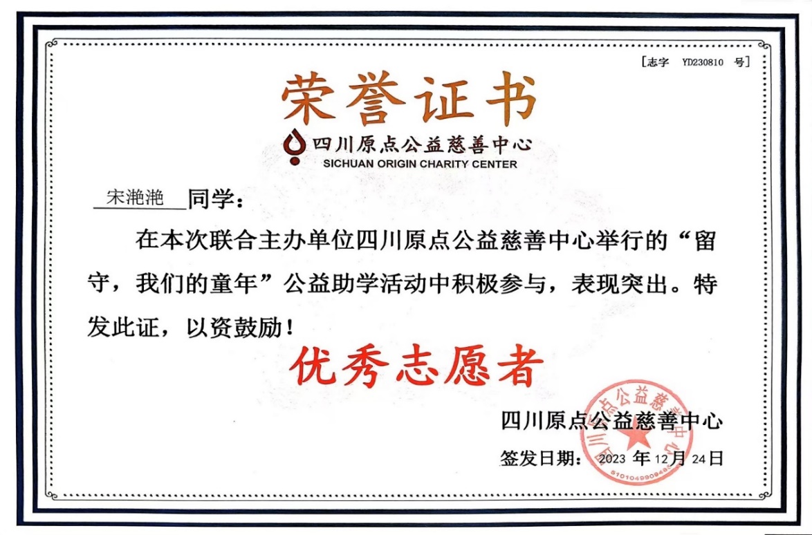 宋滟滟同学不仅学业和工作表现出色,还积极投身于校内外志愿服务,现已积累志愿时长122.小时。她参加 “留守,我们的童年”公益助学活动,让边远山区的留守儿童得到更多的关心和爱护;参加龙泉驿区龙华社区“温情遇重阳,桑榆爱满家”等志愿服务活动,为社区老人送去温暖。