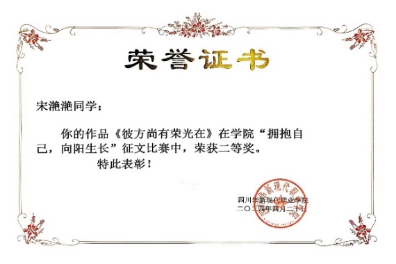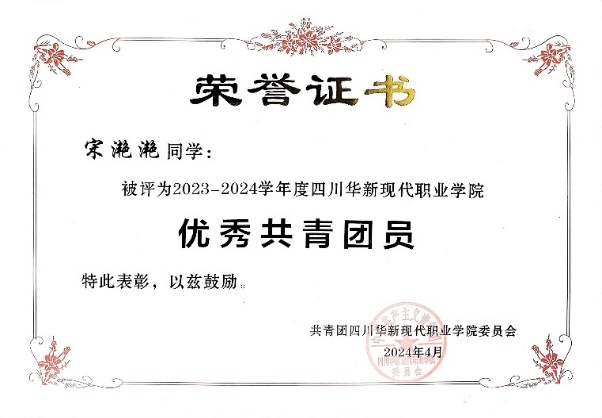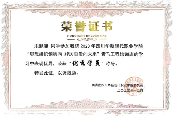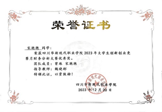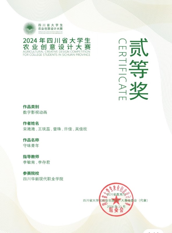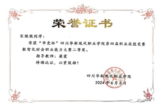 宋滟滟同学学习上勤奋刻苦,专业知识扎实,学业成绩优异,在2023-2024学年度成绩名列专业第一。她注重学历的提升,报考我校专本套读,在读本科西南石油大学会计专业,已通过科目12门。她积极主动参加各项比赛,开阔视野,提升能力,在四川省大学生农业创意设计大赛中获得二等奖。
