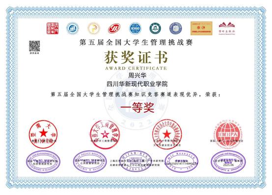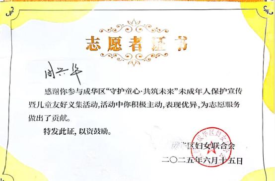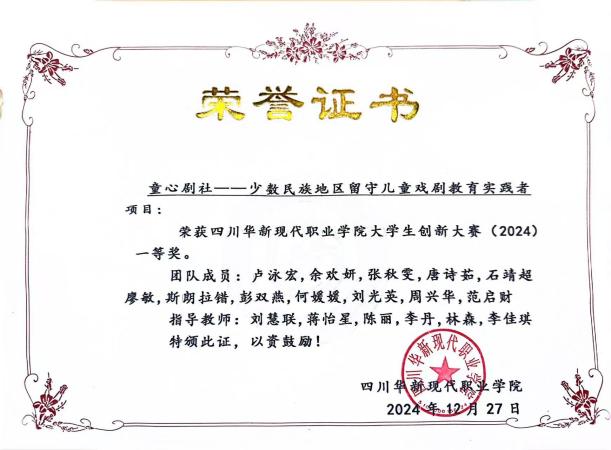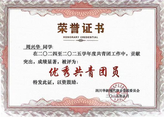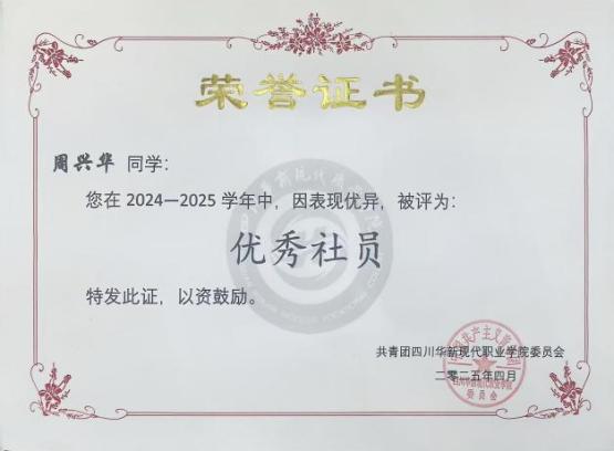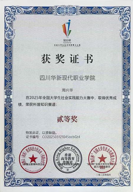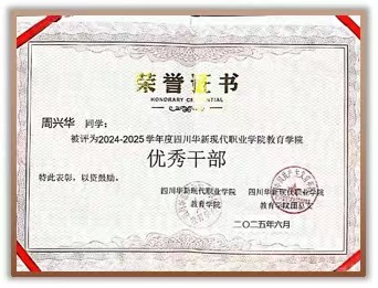 作为童心剧社社长,周兴华在专业与学业中平衡兼顾:他二课素质学分148分在全校名列前茅,同时教育学院担任团总支学生副书记,他积极组织组织和参与了各类文艺晚会、观看“纪念中国人民抗日战争暨世界反法西斯战争胜利80周年大会”直播活动、“缅怀先烈寄哀思,红色传承践初心”主题党日活动、校企合作幼儿园亲子运动会等数场活动。同时,他积极参与校外各类大小比赛,荣获2025年“国研杯”全国大学生宪法知识竞赛一等奖、第五届全国大学生管理挑战赛知识竞答赛道一等奖、“知行杯”2025年全国大学生社会实践能力大赛二等奖、四川华新现代职业学院大学生创新大赛(2024)一等奖等多项荣誉。