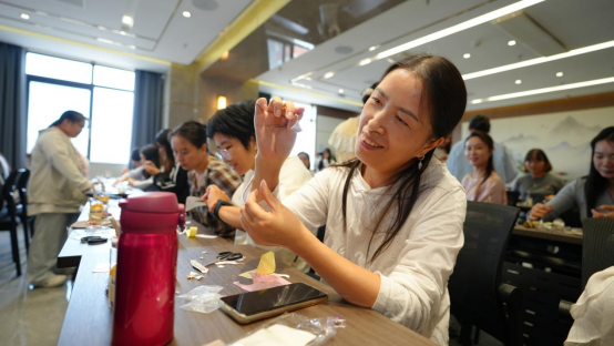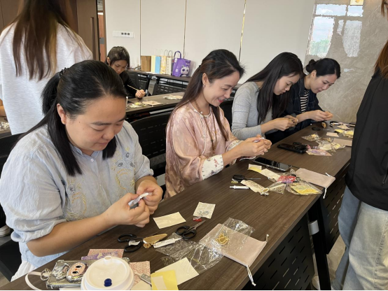 手工创作环节是本次活动的核心亮点。在指导老师的分步指导下,教职工们拿起提前准备好的织锦面料、配饰与工具,从裁剪、固定到搭配、组装,一步步将精美的锦缎转化为耳环、胸针、发夹等小巧精致的中秋饰品。过程中,大家相互交流技巧、分享创意,现场氛围温馨而热烈。指尖翻飞间,原本素雅的材料逐渐变成一件件兼具传统韵味与个性美感的手作,不仅承载着对中秋的美好期盼,更凝聚了对传统文化的热爱。