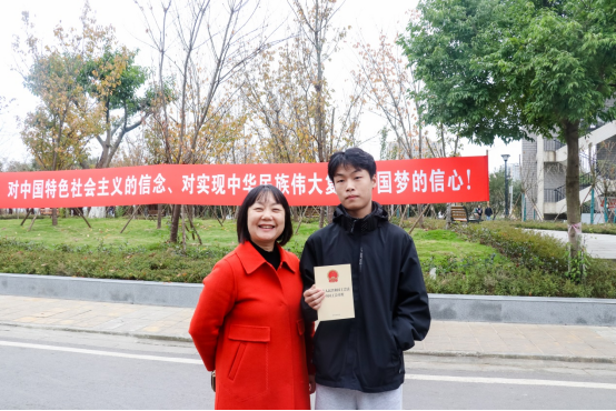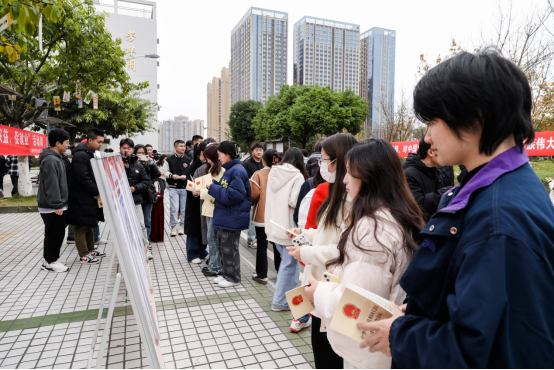 图4为:四川华新现代职业学院工会办公室主任李佳薇为学生发放工会普法书籍