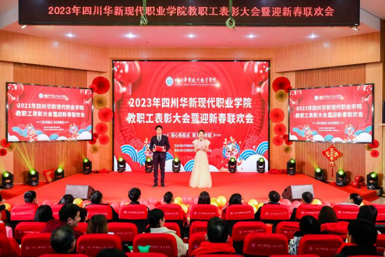 玉兔辞旧岁,瑞龙迎新春。1月11日,华新学院热闹非凡,全体教职工齐聚一堂,共同参加了学院“凝心新起点,聚力新跨越”教职工表彰大会暨迎新春联欢会,现场洋溢着喜庆祥和的节日气氛。2023年,在学院党委和学院理事会的团结带领下,全院上下凝心聚力,以推动高质量发展为主题,坚持“融合建校、专业立校、双师兴校、双元强校、勤学助校”,以“五大工程”为依托,推进内涵建设,提升人才培养质量,各项事业发展更加欣欣向荣。本次活动旨在表彰过去一年里在各自岗位上做出杰出贡献的教职工,同时借此机会加强团队凝聚力,为全体教职工送上新年的祝福。华新学院党委书记陈建生,党委副书记、院长刘斌等全体院领导,全体教职员工参加。