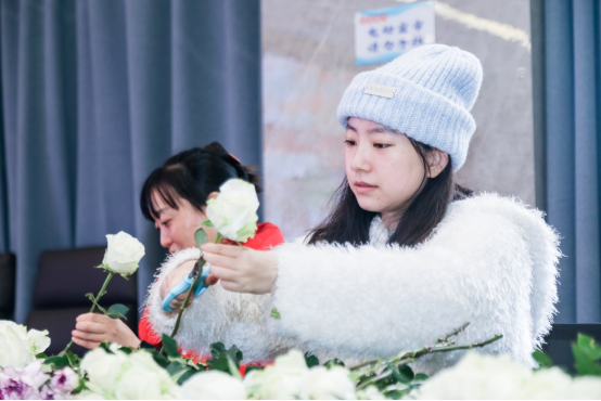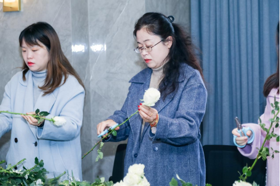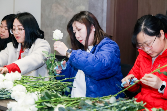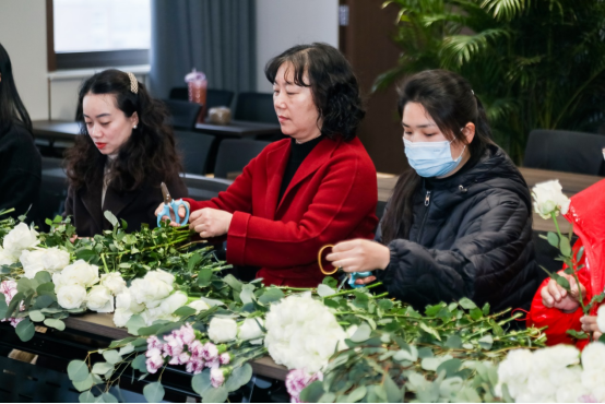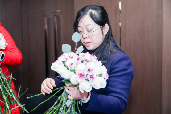 本次主题活动特邀艺术学院专业花艺师钟舒老师现场授课,从花艺知识、鲜花的保养与摆放,从花材、容器、养护、色彩搭配等方面,详细介绍手打花束的艺术造型要素和技巧手法。钟老师现场示范指导大家如何去搭配组合,如何造型才能让鲜花更显漂亮、活力。女职工们认真聆听的同时也跟着老师的步骤,一起动手参与。