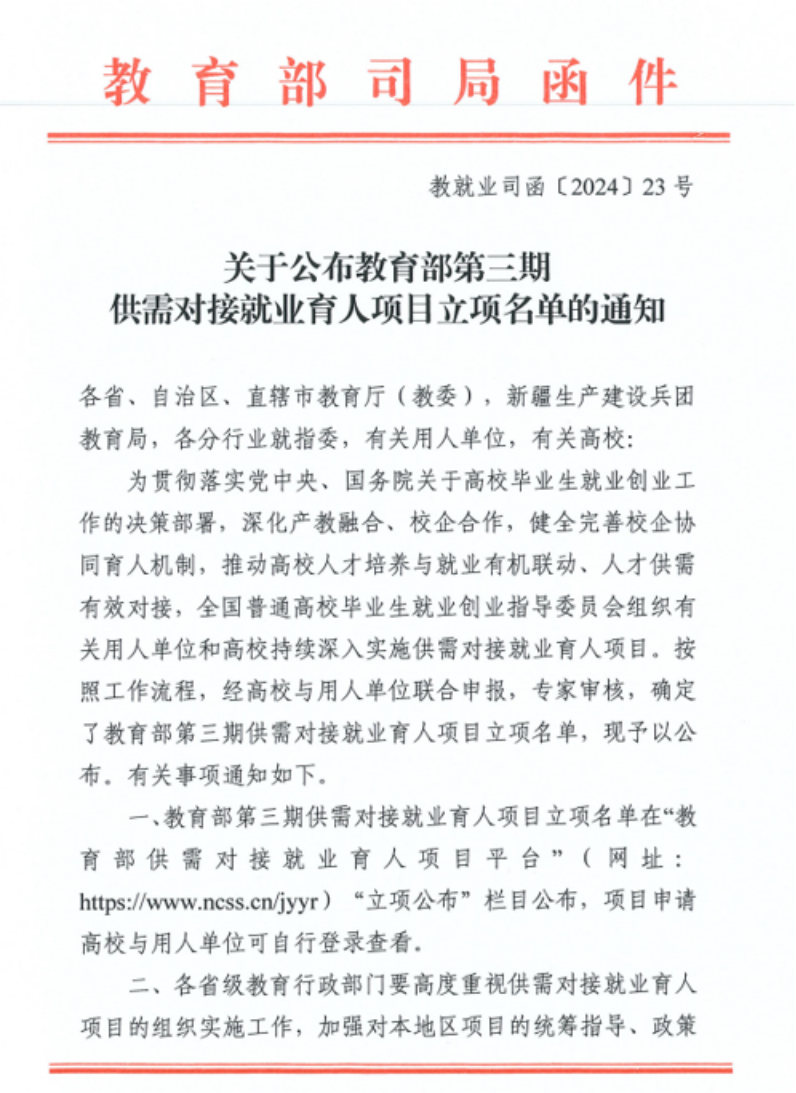 近日,教育部供需对接就业育人项目平台发布“关于公布教育部第三期供需对接就业育人项目立项名单的通知”(教就业司函[2024]23号),四川华新现代职业学院“金蝶大数据财会定向人才培养培训项目”、“京东订单班数智融合运营型人才就业实习基地项目”、“四川顺丰速运有限公司定向人才培养培训项目”、“六位一体岗课赛证融通校企合作土建人才培养”等四个项目成功立项。