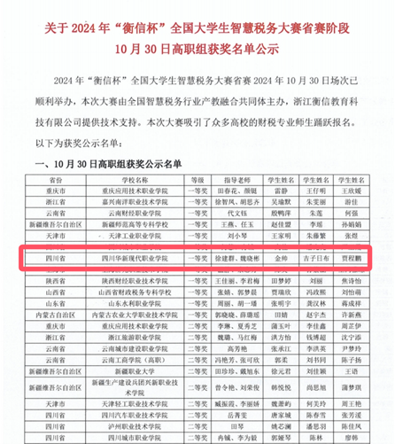 在2024年10月30日举行的第十届“衡信杯”全国大学生智慧税务大赛四川省赛中,我校数字经济学院学生在与全省30多所高校财税专业团队的激烈角逐中勇夺一等奖。