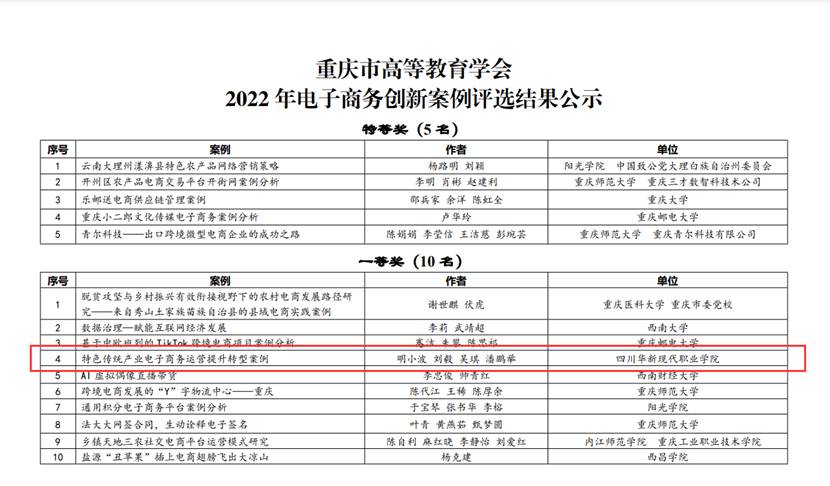 近日,由教育部高等学校电子商务类专业教学指导委员会、全国数字电商教育发展联盟、高等学校电子商务与数字经济案例中心指导,重庆市高等教育学会主办,重庆师范大学、重庆市高等教育学会电子商务专委会承办的电子商务创新案例评选活动结果公布,我院电子商务学院院长明小波、副院长刘毅、2018级电子商务学院毕业生吴琪、潘鹏举合作提交的案例的案例《特色传统产业电子商务运营提升转型案例——成都道地百草商贸有限公司》荣获一等奖。