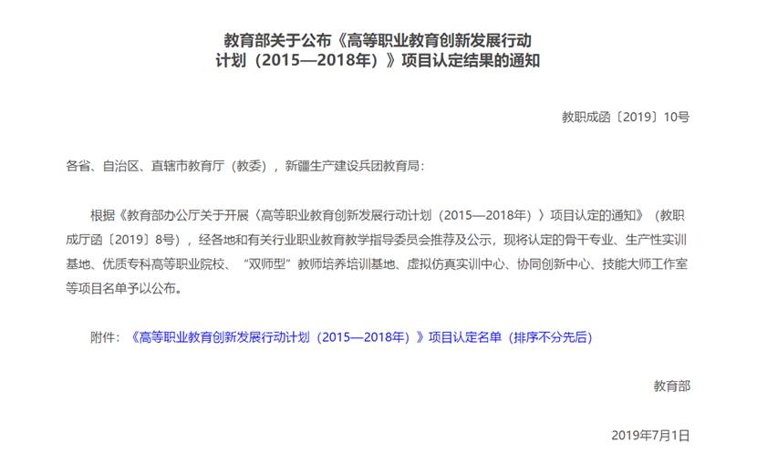 我近日,《教育部关于公布<高等职业教育创新发展行动计划(2015-2018年)>项目认定结果的通知》(教职成函〔2019〕10号)发布,备受高等职业教育界广为关注的《高等职业教育创新发展行动计划(2015-2018年)》项目认定名单正式公布,我院电子商务、移动商务专业名列其中,两个专业被认定为骨干专业,体现了教育主管部门对我院近年来办学成果的充分肯定,是我院上下共同努力取得的结果。