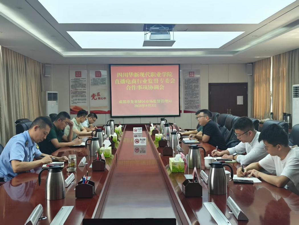 近日,四川华新现代职业学院数字经济学院在直播电商领域的深度参与和持续发力再获关注。2025年9月3日,数字经济学院副院长、直播电商行业监督专委会秘书长刘毅,西南财经大学副教授、电子商务系主任、专委会副秘书长李忠俊,学院优秀毕业生、专委会办公室主任吴琪一行赴龙泉驿区市场监督管理局参加专题会议,围绕直播电商食品监督抽检、行业规范、消费维权、达人培训等多项议题展开深入研讨,龙泉区域市场监督管理局局长牛忠江、网监科、质监科、检测检验中心相关负责人以及华测检测、CQI检测机构人员参与了此次会议。