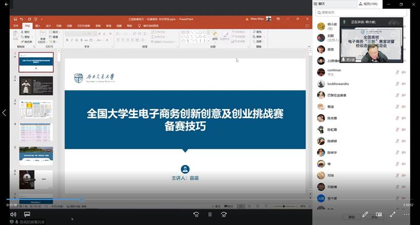 苗苗教授深入浅出地介绍了如何开启创新思维的学习和实践,以设问方式引导学生网上互动,用丰富的案例讲解形成一个优秀参赛作品的历练过程,为学生阐明“创新切入、创意升华、创业落地”、“读懂政策和趋势”、“今日事今日毕”等备赛法宝,最后以一项特等奖作品的PPT样本,对照其前后版本所经历的50多次修改的变化,生动地说明学生在备赛中智慧与努力相伴而行。