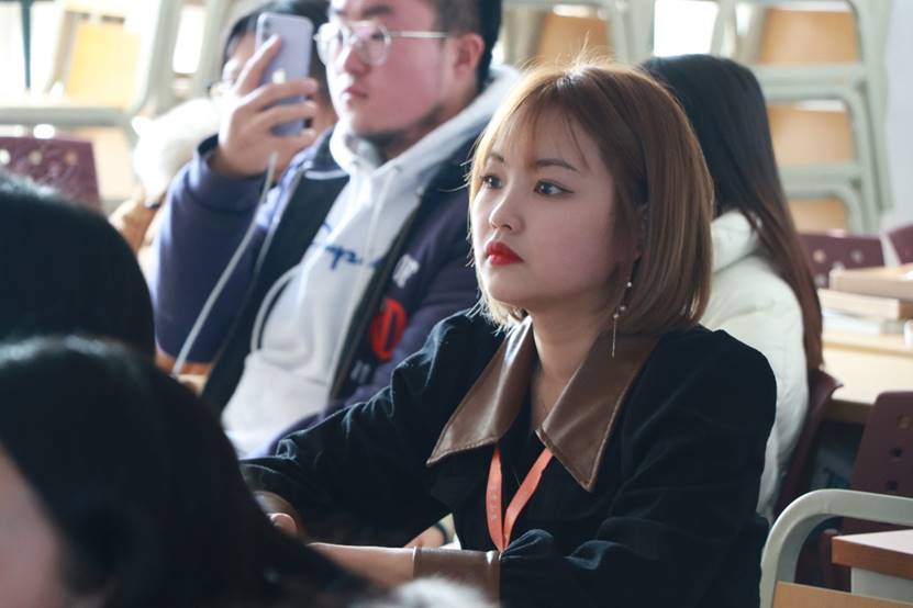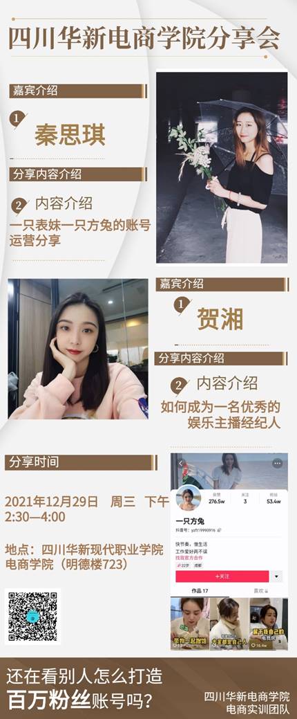 20211229日,电商学院举办直播主播分享会,邀请直播主播秦思琪、贺湘作为嘉宾,分享“一只表妹”(抖音号ling19960327)、“一只方兔”(抖音号yzft19990916)的账号运营、短视频经验以及如何成为一名优秀的娱乐主播经纪人。