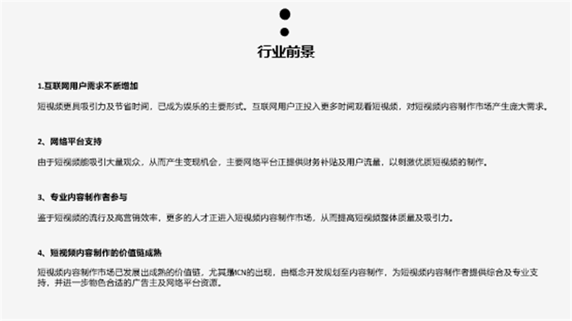 短视频以势如破竹之式快速进入到大众的视野中。除了以抖音、快手为代表的原有的头部视频平台持续发力外,传统平台也在不断分化和发展,腾讯、今日头条、百度视频也在迅速布局短视频并加大发力。短视频与电子商务结合越来越紧密,短视频能吸引大量观众,从而产生变现机会。短视频的流行及高营销效率,更多的人才正进入短视频内容制作市场,从而提高短视频整体质量及吸引力。