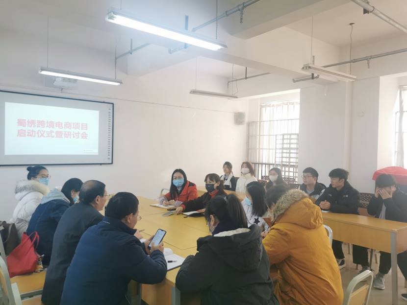 在研讨会上,针对蜀绣跨境电商项目,各位老师都积极的发表了意见,针对项目的建设、维护和运营、跨境电商如何传播蜀绣文化、跨境电商实战比赛组队方式和跨境电商专业的学生如何克服英语难关等问题展开了广泛的讨论。