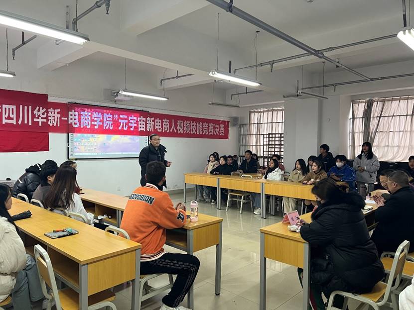 20211210日,由四川华新现代职业学院电子商务学院、四川农村电商公益职教联盟发起,四川华新现代职业学院电子商务学院主办的“元宇宙”新电商人视频创意技能竞赛决赛在明德楼723教室举行。