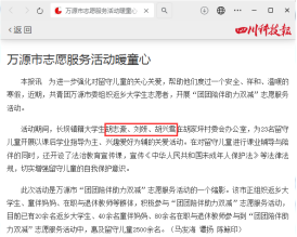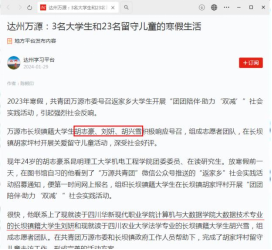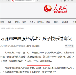 2024年1月正值寒假,华新学院2022级大数据技术专业学生刘妍积极响应万源市委发起的青年大学生返家乡寒假志愿服务活动的号召,和当地2名返乡大学生一起积极开展大学生“团团陪伴·助力‘双减’”社会实践活动。活动引起强烈社会反响,被学习强国、人民网等多家国家级主流媒体报道。