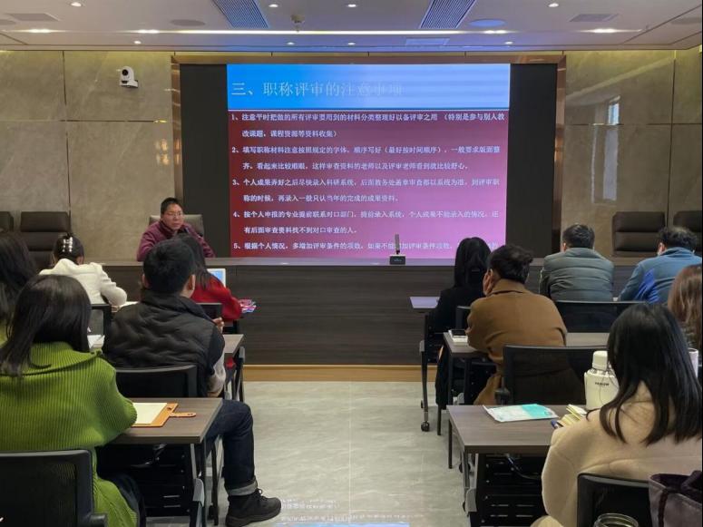 接着,辅导员张树勇副教授分享了职称评审相关经验,他主要围绕职称评审的年限、职称评审的条件、职称评审的注意事项、发表论文注意事项、网络培训注意事项和岗位进修注意事项六个方面进行详细讲解。