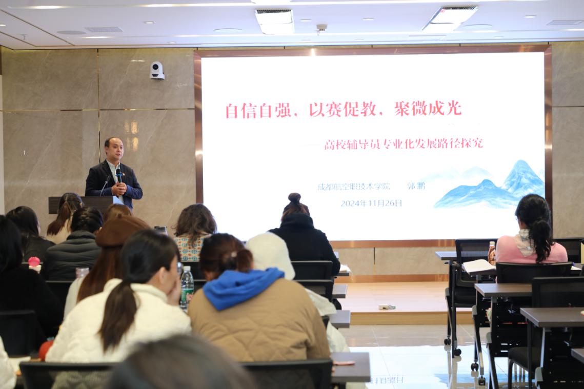 为进一步加强和推进我院学生思想政治教育工作,提升辅导员队伍理论研究能力和实践育人水平,扎实推进辅导员队伍的专业化、职业化建设。2024年11月26日,我校邀请了四川省首届辅导员年度人物提名奖,全国第三届辅导员素质能力大赛(第六赛区)二等奖、四川省第九届辅导员素质能力大赛一等奖获得者、成都航空职业技术学院辅导员郭鹏老师来校作了题为“自信自强、以赛促教、聚微成光”的专题培训。学工部部长任燕、各二级学院书记、副书记以及全体辅导员、学生处有关人员参加了讲座。培训会由学工部副部长彭娟主持。