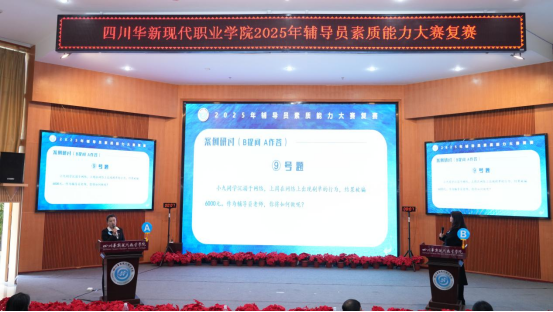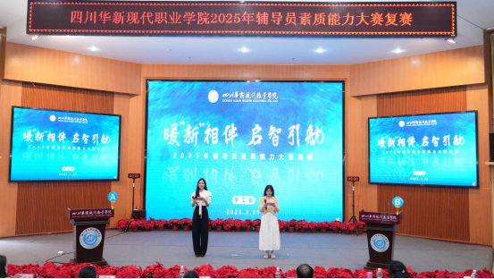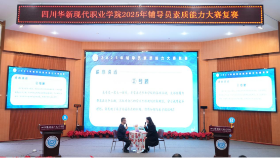 为不断提升我校辅导员理论水平、职业能力和专业素养,加快建成一支适应新时代要求、符合学校发展定位的高素质辅导员队伍,3月25日下午,华新职院2025年度辅导员素质能力大赛复赛在学术报告厅举行。学院党委副书记李瑜、学院副院长翁艳出席,成都航空职业技术学院郭鹏、学工部(学生处)、党院办、组织部、心理健康中心相关负责人担任评委,各二级学院书记副书记、辅导员以及部分学生代表现场观看了比赛。