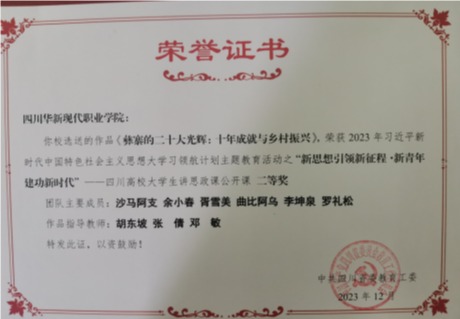参加校外比赛年年校外获奖。五年来,马克思主义学院思政课教师获全省高职院校“精彩一课”获二等奖1次,获全省高职院校新进思政教师说课比赛二等奖1次,“大学生讲思政课”获特等奖1次,一等奖2次,二等奖2次。经典诵读代表四川开放大学参加全国开大系统思政课教学比赛分获一等奖1次,二等奖1次。“经典诵读”获一等奖2次,优秀奖1次。2023年,何敏荣获省教育厅“四川学校思政课教师年度人物”提名奖。2024年3月,在省教育厅组织的2023年四川省职业学校思想政治课程示范课申报工作中,史艳红老师代表华新学院报送的“形势与政策”课程《赓续历史文脉 谱写当代华章——深入学习贯彻“习近平文化思想”》获批认定。