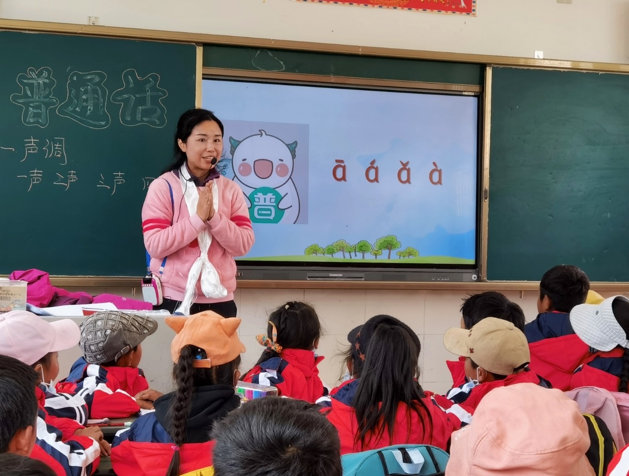 在道孚县色卡乡中心小学三年级的教室里从9岁到16岁的学生都有。李凡克服严重的高原反应,以“优美动听的语言从这里开始”为主题,为学生讲解普通话的声调。通过幽默风趣的语言组织、良好课堂情绪的调动、新颖有趣的游戏环节,使得小学生在轻松愉快的环境中初步掌握了普通话的标准调值与升降调。孩子们不畏困难,认真听课,按照要求从“啊、喔、鹅……”到“妈、麻、马、骂”认真发音,课堂上与李凡老师积极互动,孩子们普通话语音面貌有了明显改善。一双双求知若渴的眼睛、一张张热情洋溢的脸庞、一遍遍对文字发音的重复以及一次次争先恐后的举手提问,响亮而标准的普通话在校园回荡。