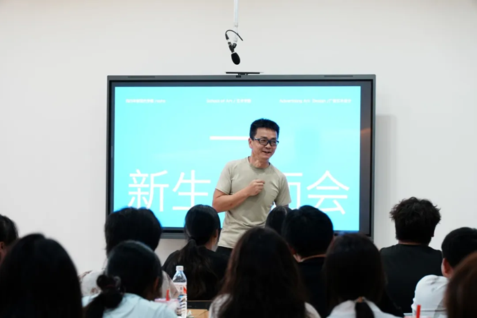 在会上影视广告策划与制作专业负责人张舒雅回顾了本专业办学情况与发展历程,介绍了师资配备、课程安排与专业培养计划,展示了近年来专业教师和学生在学科竞赛、科研训练、社会实践、工作就业等多个方面取得的优异成绩。帮助新生形成正确的专业认知,增强对学科的认同感。给同学们提出了中肯的建议,鼓励大家不断提升专业能力。专业学科带头人成都大学美术学院院长代钰洪教授通过“学习”“生活”“朋友”“身体”“规划”五个关键词来勉励新生们珍惜大学生活的每一天。同时影视广告策划与制作的全体专业教师也对同学们寄语了希望,鼓励大家在这三年的学习生涯里找到自己的发展方向和奋斗目标。