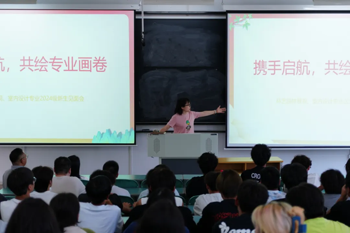 风景园林专业和室内装饰设计专业负责人钟舒、伍韬分别在专业定位、人培方案、师资力量、课程体系、职业岗位、专业成果等六个方面对学生们作了具体介绍。系统阐述了所学专业的基础课程、核心特色课程、给学生指明学习路径与学习方向。最后环境艺术设计的全体专业教师呼吁同学们无论是在风景园林的广阔天地,还是在室内设计的细腻空间,大家都要勇敢地追求梦想,不断学习,不断进步,成为行业的佼佼者。