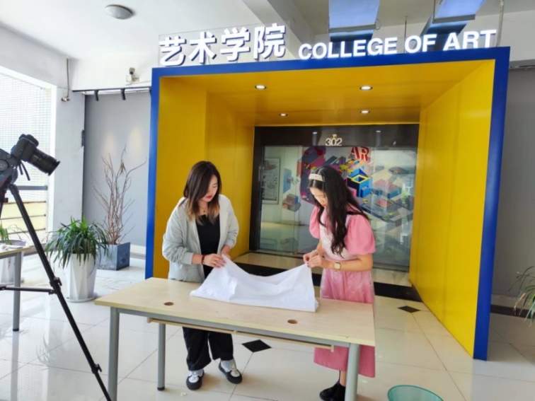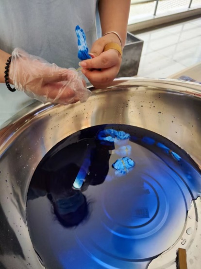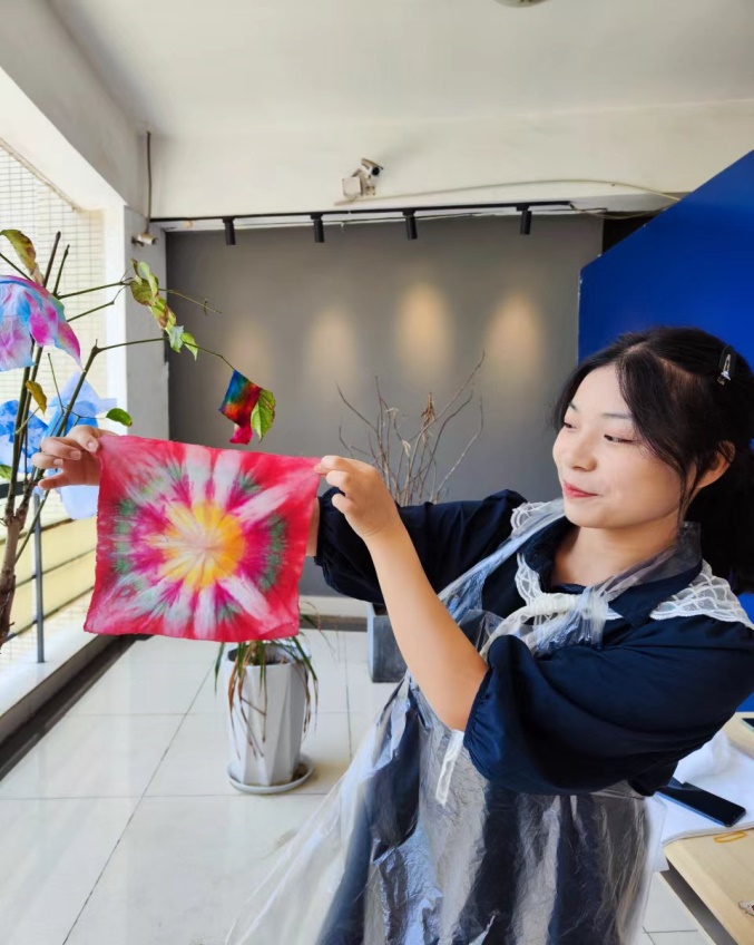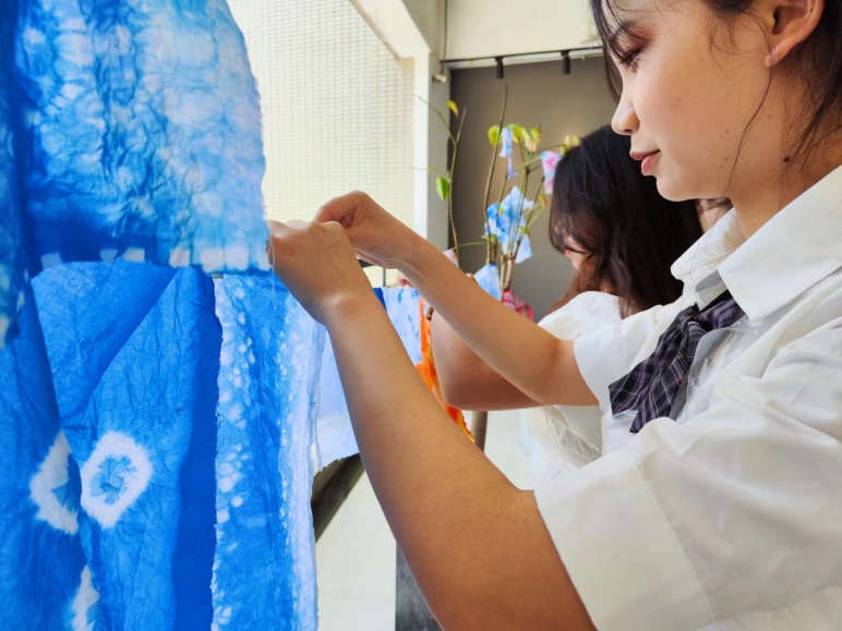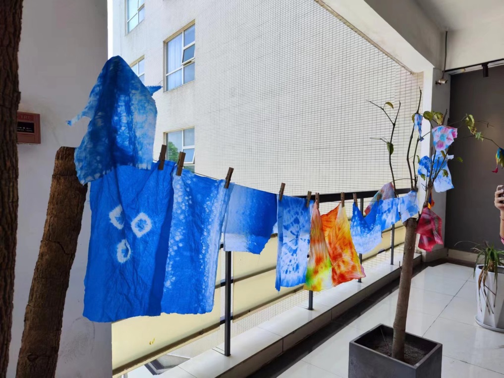 艺术学院把扎染这项非遗技艺引入校园,通过“心育”和“美育”的有机结合,引导学生以最朴实的技术尝试扎染流程,体会民族艺术带来快乐的同时,也让同学感受到了来自自然的朴素简美。
