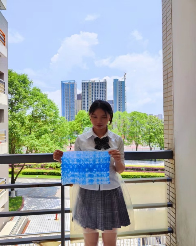 扎染的神奇之处在于永远无法预知自己的作品会以怎样独特的形态呈现出来。因此,每一次打开染布时,对学生们来说就像拆盲盒,充满好奇与期待。“其实扎染的过程并不复杂,可以充分发挥想象力,制作自己想要的作品。”学生罗川杰对扎染有着自己的理解,如今在学校就可以学习这门技艺,并能够独立完成扎染作品,他感到非常高兴。