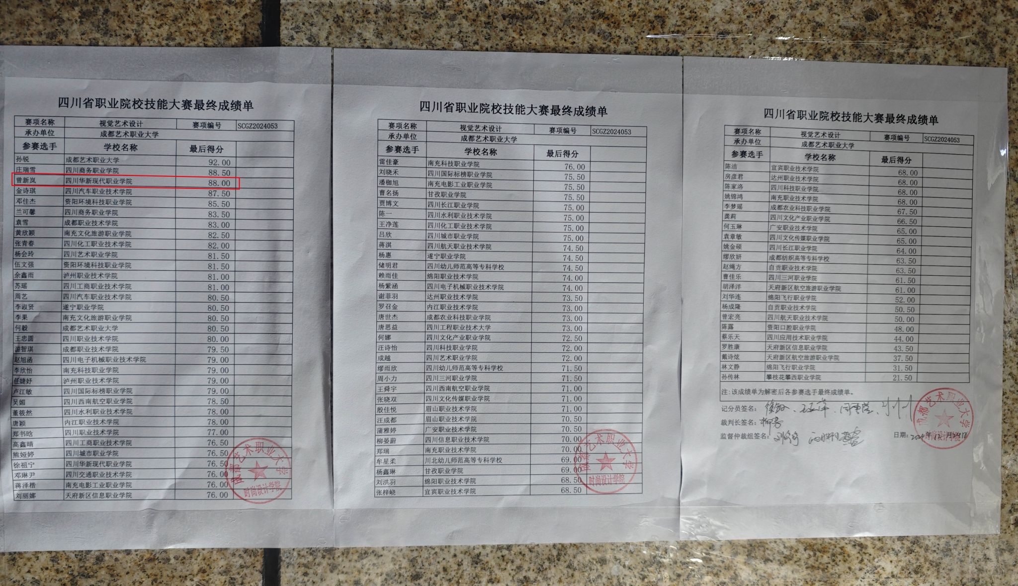 近日我院参加的2024年“中银杯”四川省职业院校技能大赛数字艺术设计赛项和视觉艺术设计赛项分别在四川工商职业技术学院和成都艺术职业大学举行,两个赛项全省分别有56组和88组高职院校的学生同台竞技。我院由专业教师带队分别选派广告艺术设计专业曾新岚同学,艺术设计(数字艺术设计)专业汪佳卉、李度宜、杨浩、吴贺铭同学参加比赛,在连漪、杨旭、孙义超指导教师团队的悉心指导下,刻苦训练、团结协作,从激烈的竞争中脱颖而出,两组学生均以总分排名第三的优异成绩勇夺一等奖。