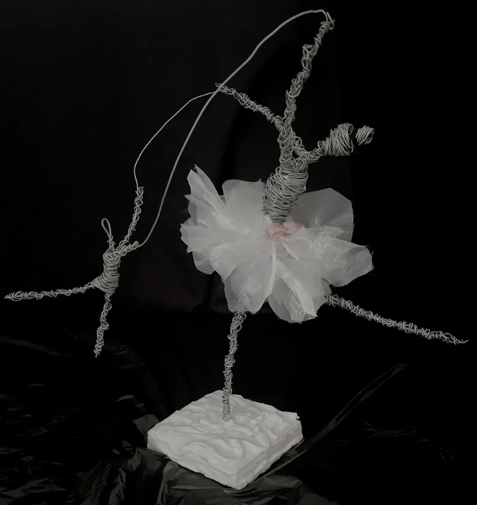 设计参照芭蕾舞女孩和元歌的形象,通过金属丝与白色丝纱的结合,底座采用白色粘土制成。芭蕾是一朵怒放的玫瑰和一位不染凡尘的精灵、高贵的公主、也是一只优雅的天鹅,但都牵着无形的线,是束缚、也是羁绊。在舞台,拥有着栩栩如生的傀儡,即使这样任何都困不住在舞台上起舞。