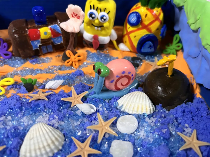 比奇堡是一个海底世界,我们用快递纸盒来做他整体的轮廓,给他涂上蓝色和绿色的颜料代表的是海水和海草的颜色,用太空沙和超轻粘土来制作海滩,然后用石塑粘土捏菠萝屋和章鱼哥的家和派大星的家再给他们涂上颜料,用石子和小贝壳、小海螺、小海星来营造一个更好的海底世界,整体就是一个缩小版的比奇堡。