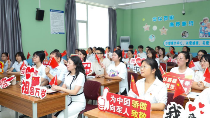 2025年9月3日上午,纪念中国人民抗日战争暨世界反法西斯战争胜利80周年大会在北京天安门广场隆重举行。中共中央总书记、国家主席、中央军委主席习近平发表重要讲话并检阅部队。为深入学习贯彻习近平总书记重要讲话精神,弘扬伟大抗战精神,医护康养学院组织师生代表在知行楼H2-7教室集中收看直播盛况,各班级、实习生则是通过网络端收看。