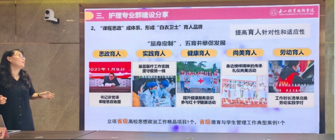 董院长分享了其所在护理高水平专业群建设过程中,围绕打造高水平专业群、建设优质一流核心课程、开发优质核心教材、培养高水平双师队伍、建设高水平实习实训基地等工作实施情况。她向与会老师展示了乐山职业技术学院在首轮“双高”建设中所组建的“白衣卫士”育人品牌“五育并举”的发展逻辑和“雁阵文化”的提炼成果,分享了专业群建设经验,提出了“AI赋能、数字化教学新生态”的构建前景。
