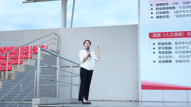 升旗完毕后,学院党支部书记杨敏做了题为“红医铸魂强根基、‘四度’融通启新程”主题讲话。医护康养学院结合五育并举”、生涯理论与大健康行业发展现状,医护康养学院构建三维递进育人模型,以厚度(医德深厚)、温度(人文温暖)、宽度(视野宽阔)、精度(技术精湛)四维协同培养,设具体指标,目标是使学生德技并修,契合行业需求,助力高质量就业。