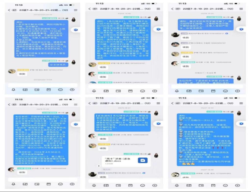 除了主题班会,我们还通过辅导员老师在学生班级群中发送反诈提醒信息,利用班会团会时间开展反诈网络安全教育,确保每位学生都能受到及时、有效的教育。