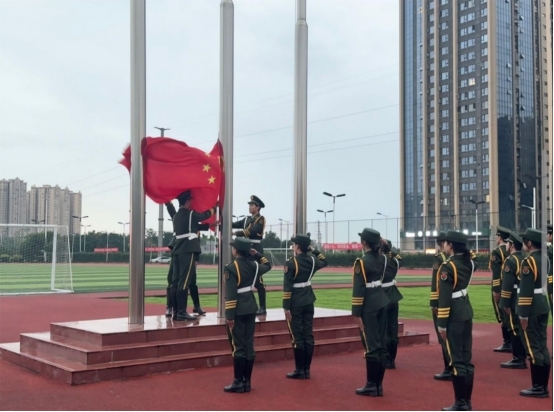 清晨的阳光洒满整个足球场,全体师生肃立,面向国旗,行注目礼。随着国旗护卫队的入场,雄壮的国歌声响彻云霄,五星红旗冉冉升起,激发了每一位在场师生的爱国热情。