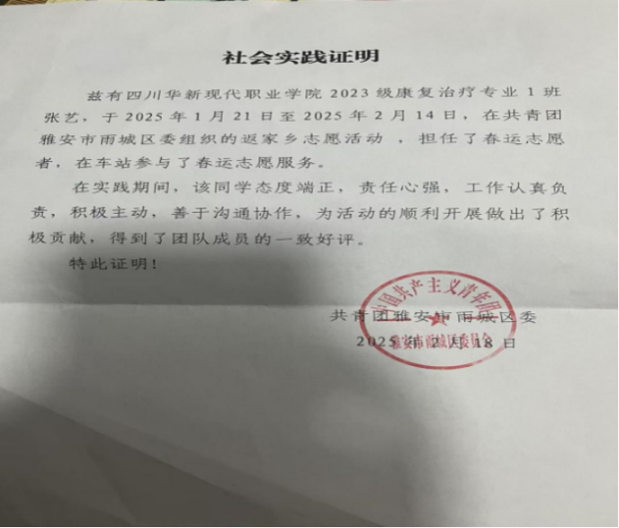 在寒假这个充满温情与团聚的季节里,四川华新现代职业学院医护康养学院的学子们没有选择安逸,而是积极响应国家号召,投身于大学生寒假“返家乡”社会实践活动中。他们以实际行动展现新时代青年的责任与担当,其中,2023级康复治疗技术一班的张艺同学,在雅安市雨城区西门汽车站开展的春运志愿者活动中,用她的热情与专业,为归乡的旅客送去了温暖与便利,成为了此次活动的亮丽风景线。