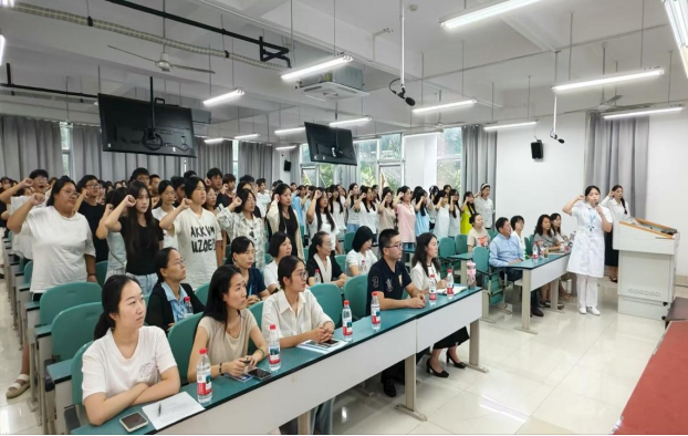 在庄严的宣誓仪式中,护理专业负责人钟琭葭老师带领新生们进行了医者誓言的宣读。誓言铿锵有力,表达了新生们对医学事业的热爱与坚守,也标志着他们正式踏上了医护康养的学习之路。